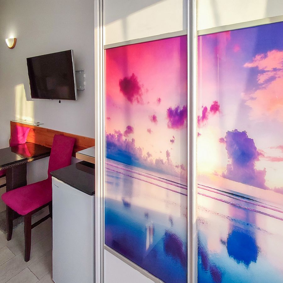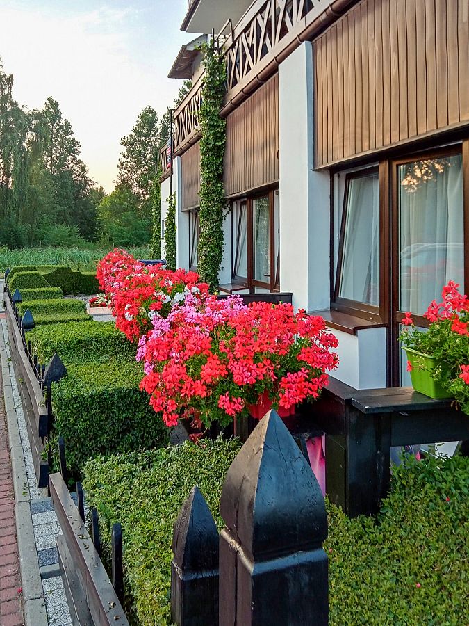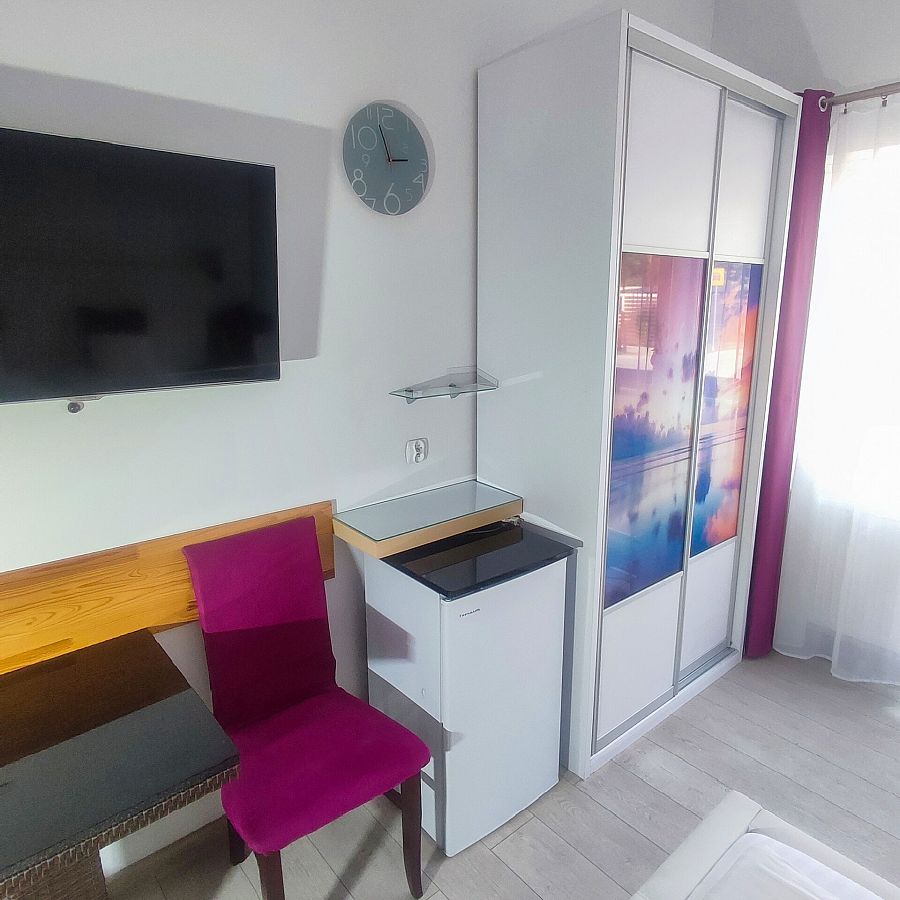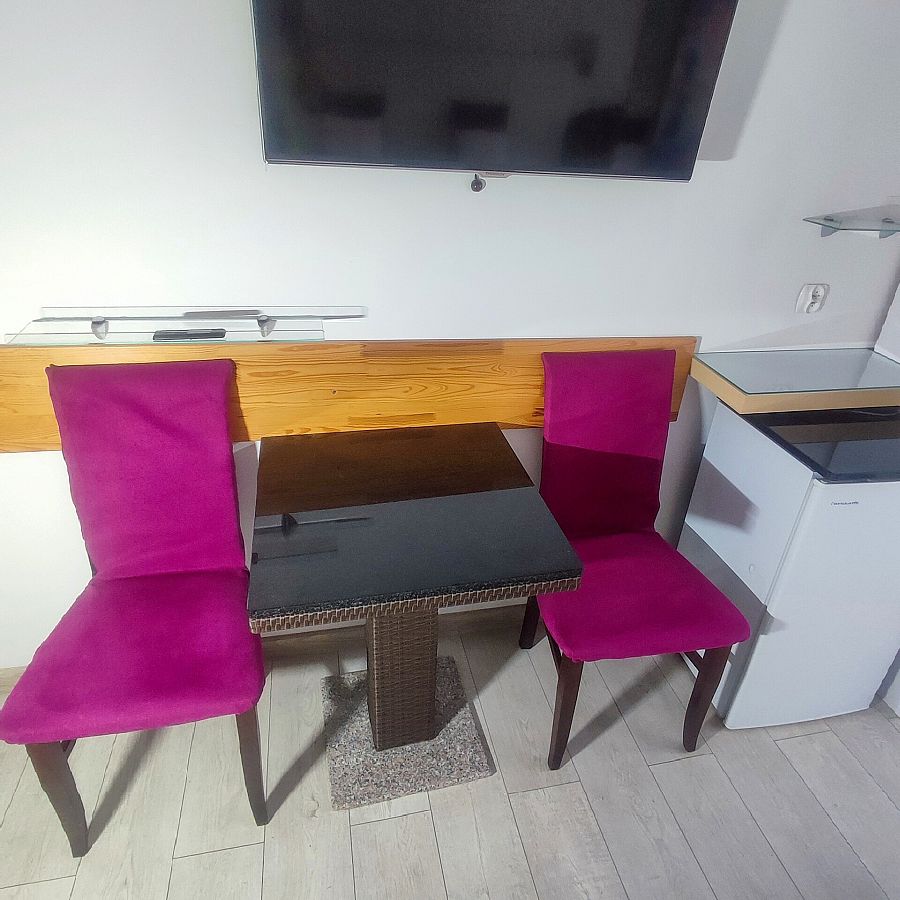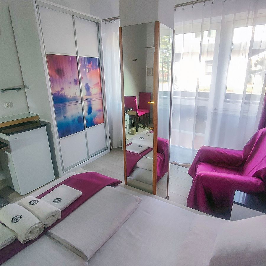 Dwuosobowy pokój na parterze od strony zachodniej. Bezpośrednie wyjście na zewnątrz poprzez mały taras z drewnianymi barierami. Na tarasie przysłoniętym kwitnącymi pelargoniami bluszczolistnymi dwa krzesła technoratanowe, linki do suszenia. Kolorystyka pokoju — białe ściany, biała cegiełka nad łożem podświetlana kolorowymi ledami, fioletowe zaciemniające zasłony na kółkach. W łazience motyw fioletowych czosnków. Na wyposażeniu pokoju szafa z grafiką szklaną " Zachód słońca nad morzem ", tapicerowane łoże małżeńskie (160 cm), Tv Thompson 42 cal, fotel, stolik, 2 krzesła, lodówka (80) cm. W łazience kabina półokrągła (80 cm) lustro podświetlane podwójnymi ledami, podwieszana szafka z wysuwanymi szufladami. Na podłodze jasne panele. Możliwość postawienia samochodu przy pokoju.