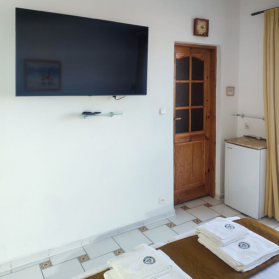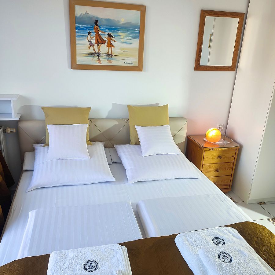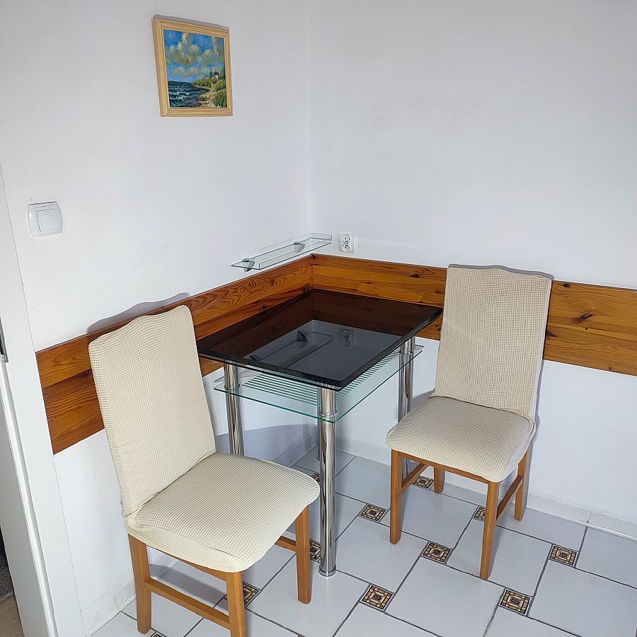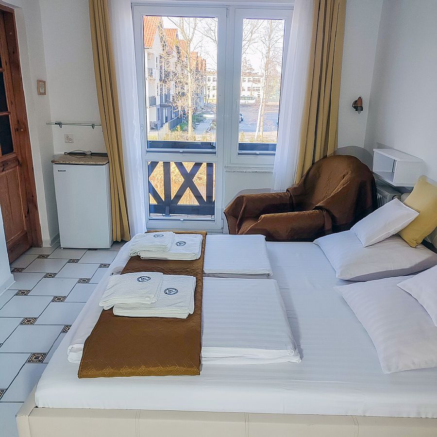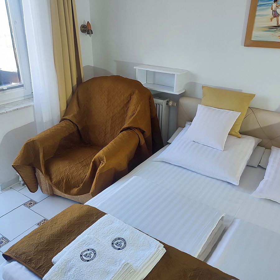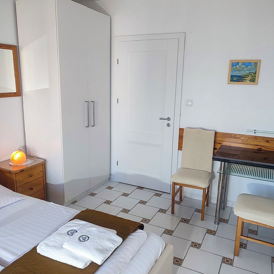 Dwuosobowy pokój na pierwszym piętrze od strony północnej z widokiem na rzeczkę Chełst i drewniany mostek (do plaży). Na balkonie dwa krzesła technoratanowe, stolik i linki do suszenia. Wyposażenie pokoju — łoże tapicerowane (140 cm szer), fotel, pojemna szafa, tv 32 cal, lodówka (80 cm), kącik śniadaniowy (dwa krzesła, stół). Jasna kolorystyka (na podłodze białe płytki ceramiczne z mozaikowa kostka.