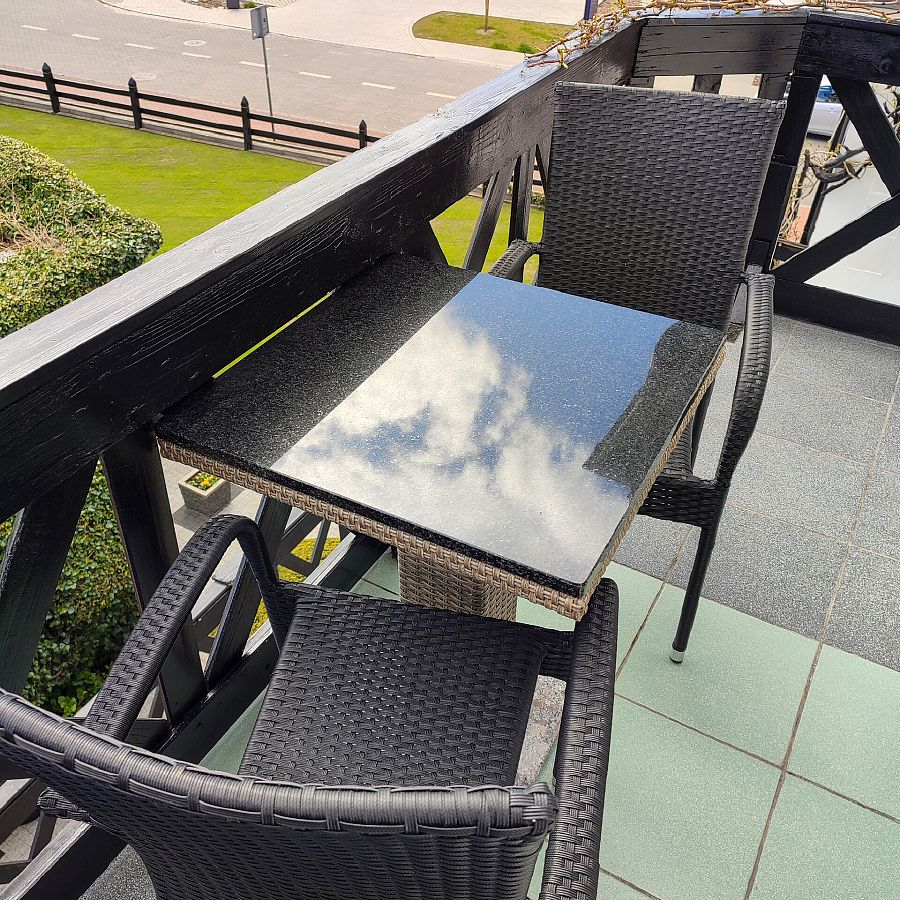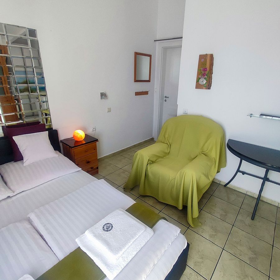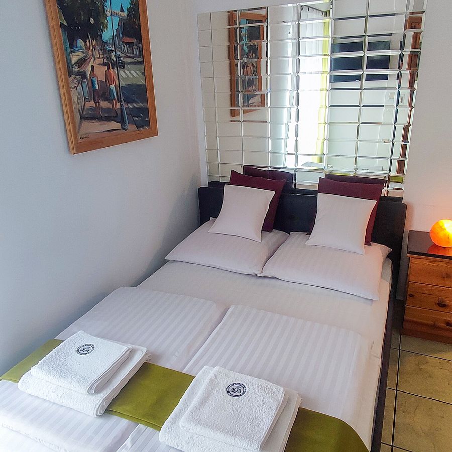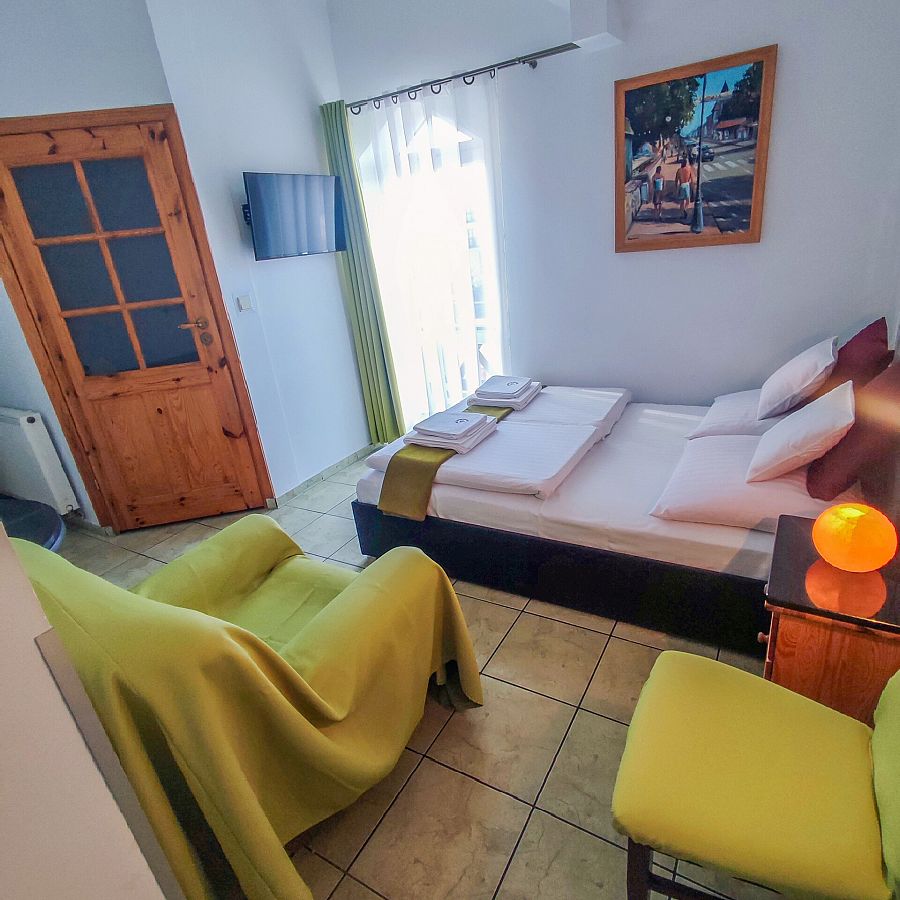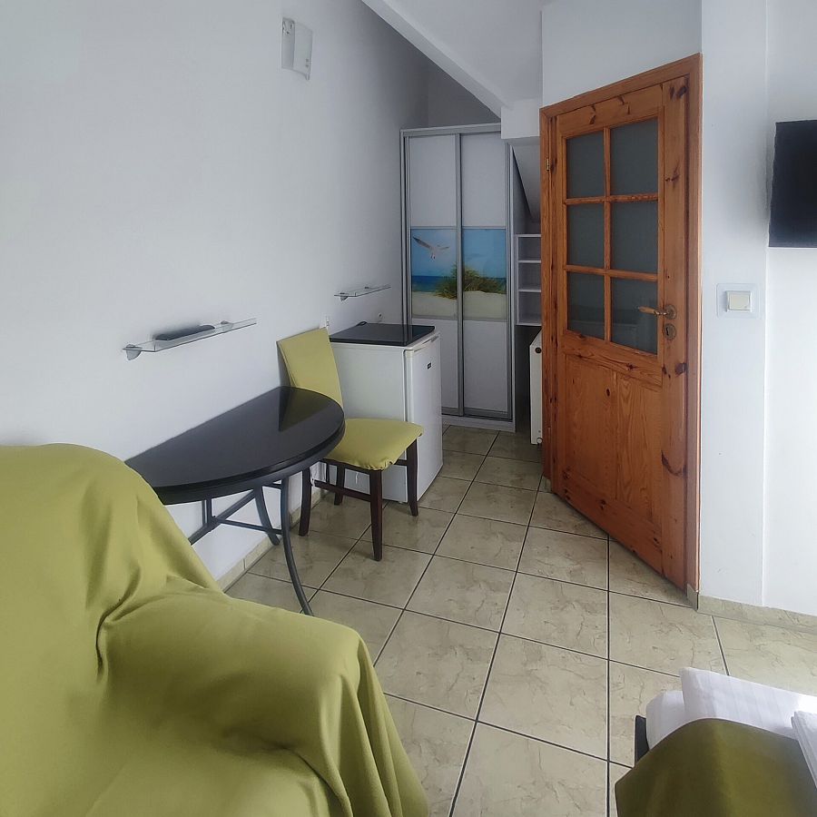 Kameralny, narożnikowy pokój dwuosobowy na drugim piętrze w części południowo-wschodniej budynku. Z balkonu widok na otoczenie "Zawiszy" i pobliskie ulice. W pobliżu wypożyczalnia rowerów (50 m), bary, punkty handlowe i drewniany mostek na Chełście. Do głównego deptaka miasta tylko 300 m. Na balkonie dwa krzesła technoratanowe i stolik. Na wyposażeniu pokoju łoże małżeńskie (140 cm szer.), szafa z grafika szklana (Mewa i wydmy), fotel, stół, dwa krzesła, podwieszany TV 32 cal LG, lodówka (80 cm wys.) Obraz K. Kloskowskiego przedstawia scenkę z letniej Łeby "Spacerowicze na ul Nadmorskiej". Pokój wyciszony zasłonami zaciemniającymi "Blackout", firany woal. W kolorystyce pokoju dominuje zieleń. W takim kolorze jest łatwa w utrzymaniu czystości podłoga z płytek ceramicznych. Na korytarzu duża lada z grafika szklana ("Łebskie plaże") i mikrofalówka.