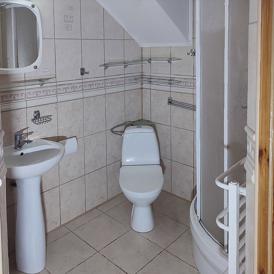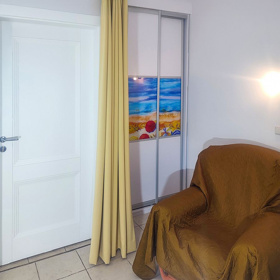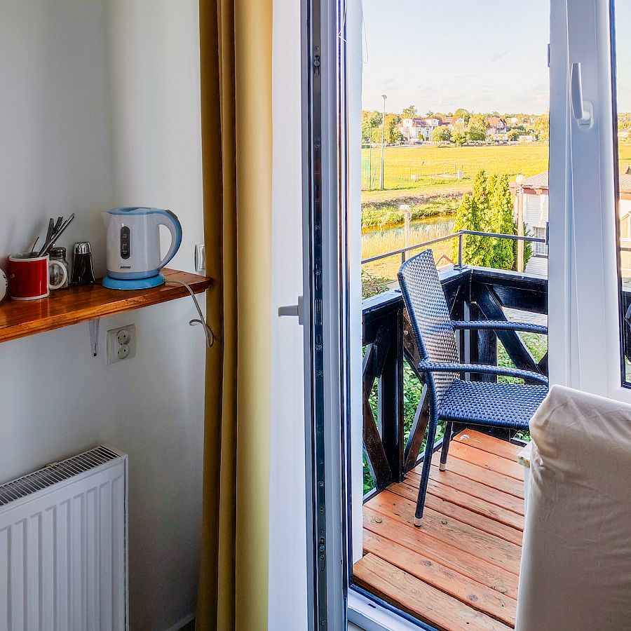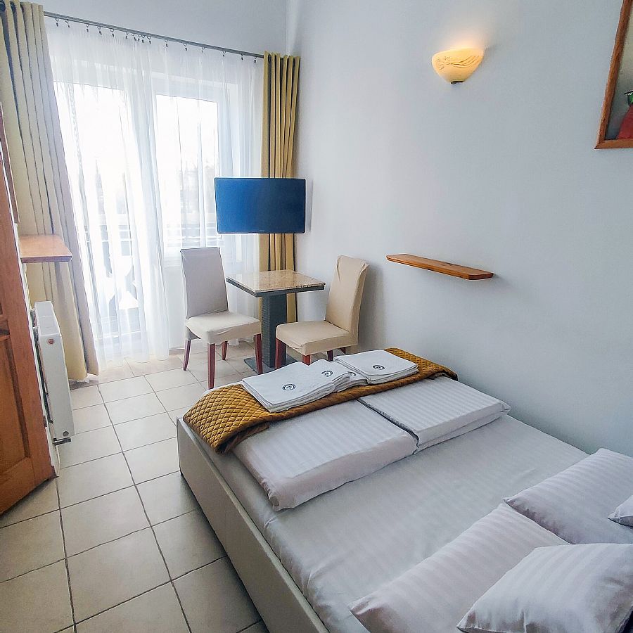 Pokój 2-osobowy na drugim piętrze, bez balkonu, od strony wschodniej. W pokoju łoże małżeńskie tapicerowane (białe), szafa z grafiką szklaną ("Plaża"). Ponadto stół, krzesła, lodówka 80 cm wys., fotel, TV 32 cale, szafka. Łazienka jak i płytki na podłodze w kolorach beży. Oświetlenie punktowe - 6.