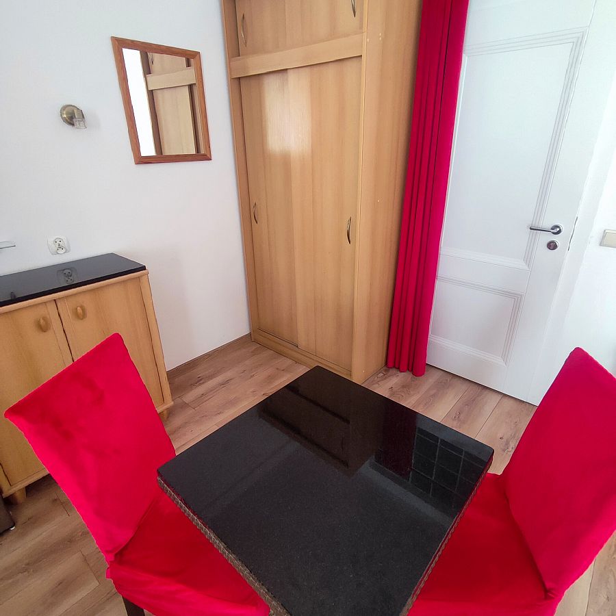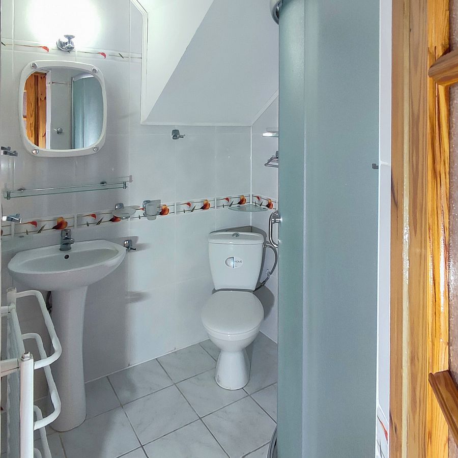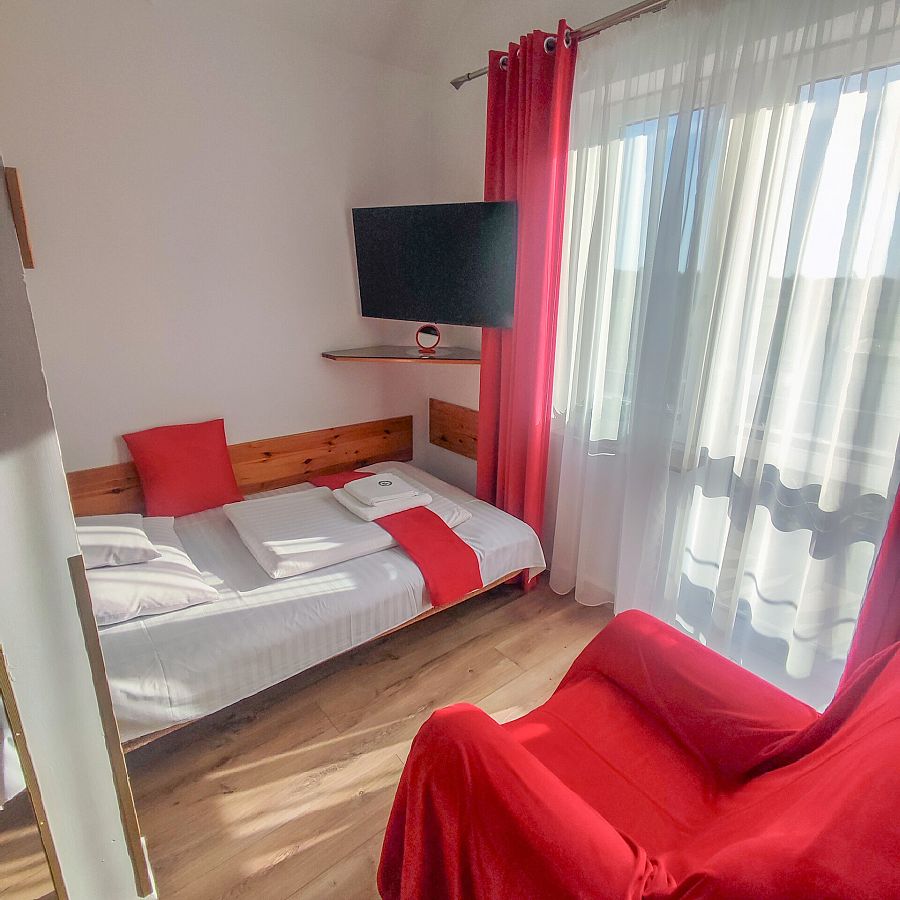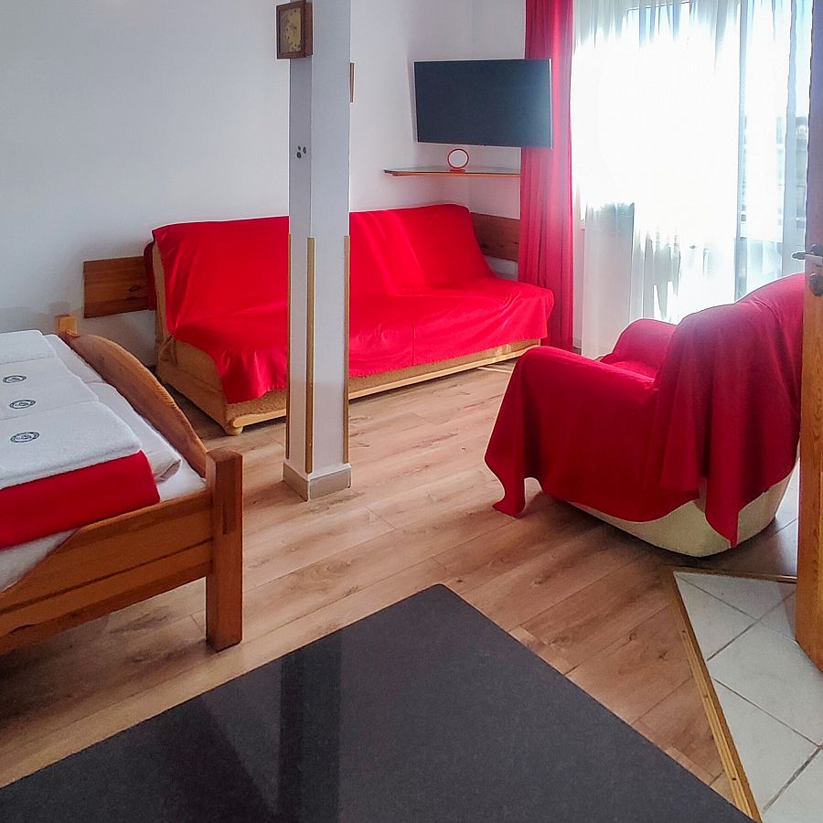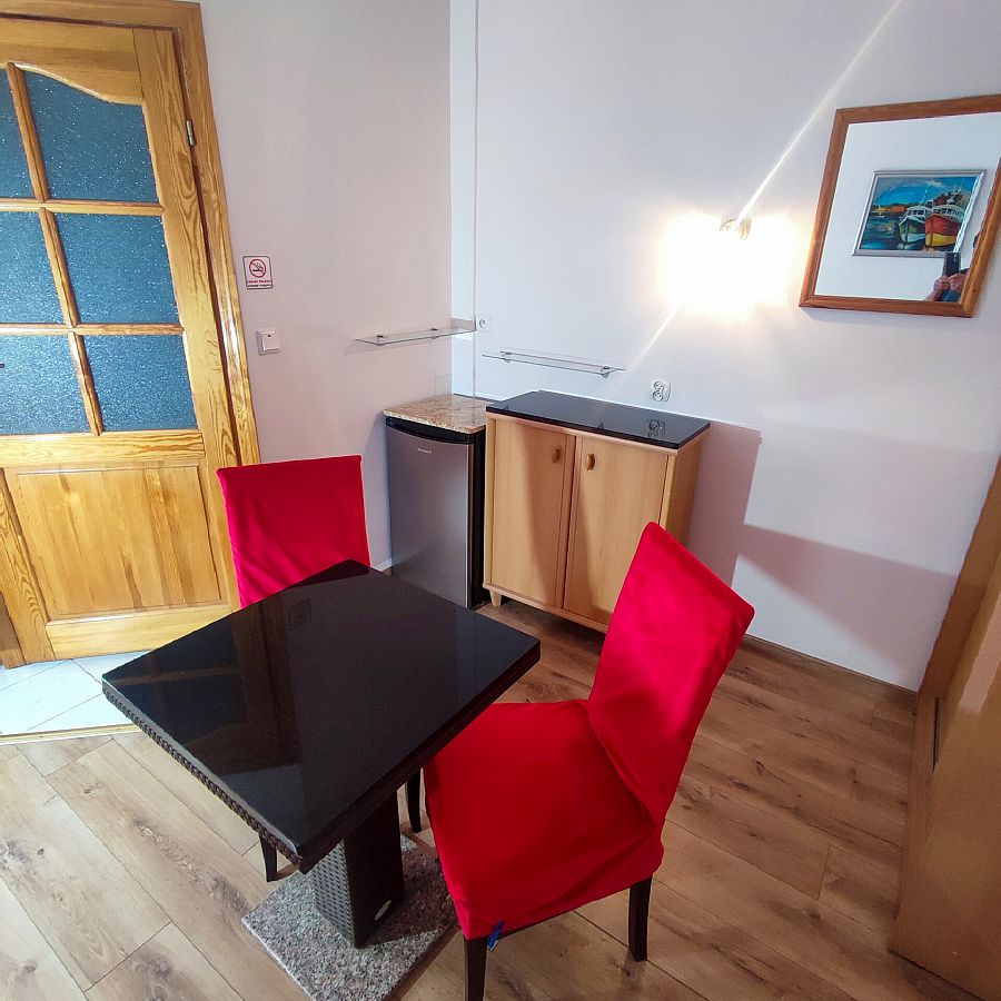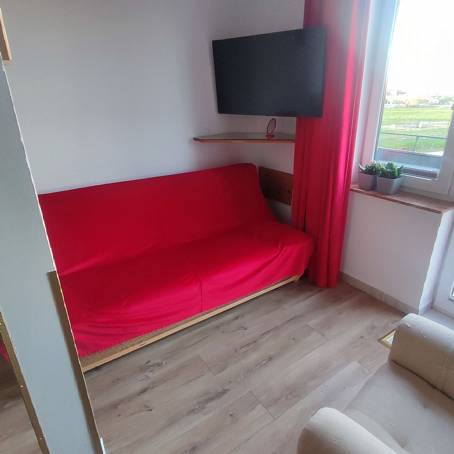 3,4-osobowy pokój na drugim piętrze. Dzięki położeniu od strony wschodniej pomiędzy pok. nr 14 i 17 jest to jeden z najbardziej wyciszonych pokoi w naszym obiekcie. Na jego komfort ma również wpływ wielkość i "trzymanie" ciepła w okresie zimowym. W bezpośrednim sąsiedztwie znajduje się bojler z ciepłą wodą. Na wyposażeniu pokoju jest duże (160 cm szer) sosnowe łoże małżeńskie, łatwo rozkładana funkcjonalna wersalka "Ewa". Oprócz tego szafa bukowa z przesuwanymi drzwiami, komfortowy fotel, lodówka (80 cm wys.), podwieszony TV led Sony 32 cal. Kącik śniadaniowy to stół i 2,3 krzesła. Na stole biały obrus przykryty szybą z zaokrąglonymi rogami (udostępniamy płyn do mycia szyb i papierowe ręczniki). Przy pokoju na dużej ladzie z grafiką szklaną (Łebskie plaże) - mikrofalówka. Obraz w pokoju przedstawia "Kutry w porcie rybackim ". Całość utrzymana w ciepłych kolorach. Podłoga — panele. W łazience białe płytki z motywem kwiatów, kabina prysznicowa (80 cm szer). Na balkonie stolik, dwa krzesła technoratanowe, linki do suszenia. Z balkonu widok na Kanał Chełst, obiekty sportowe, tereny zielone, drewniany mostek ze ścieżką do plaży. 400 m dalej kanał zamienia się w malowniczy port rybacki z licznymi smażalniami i wędzarniami ryb.