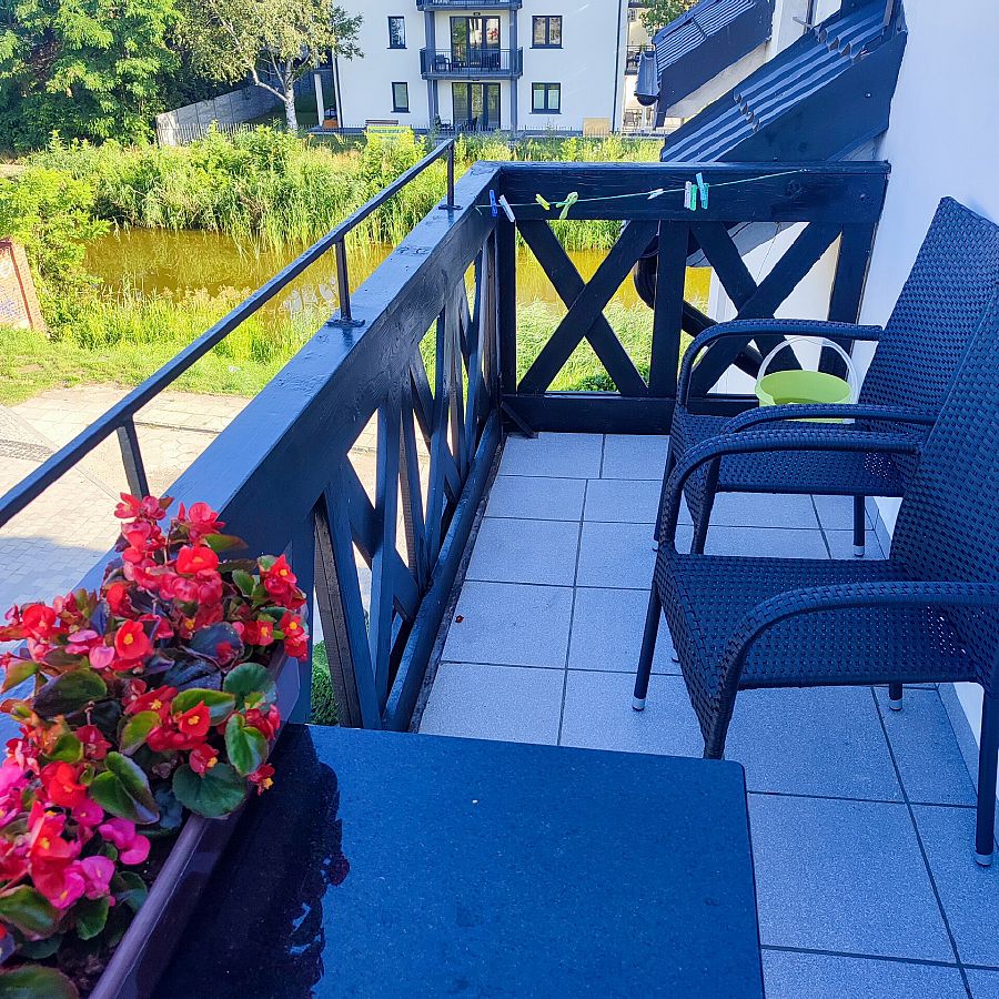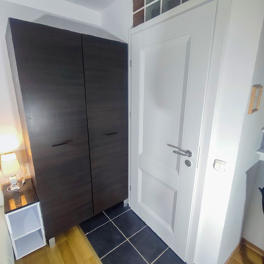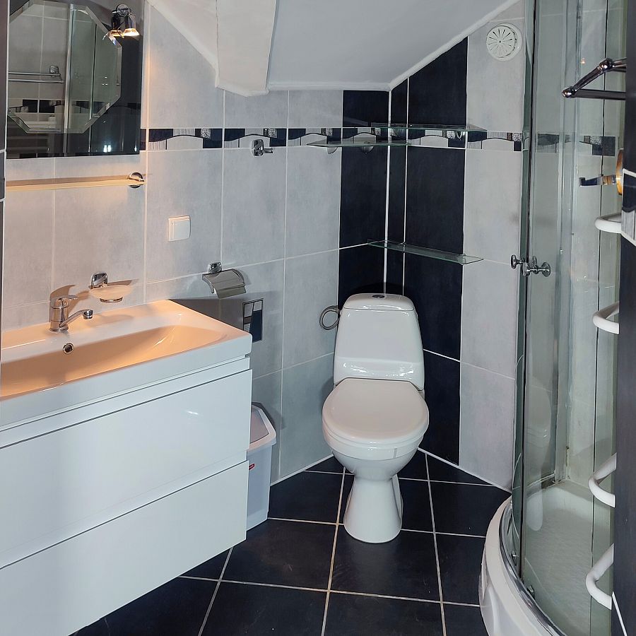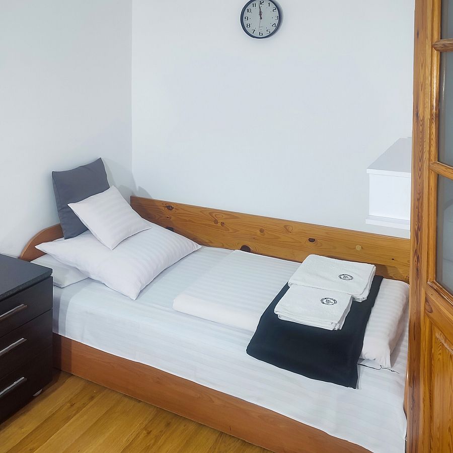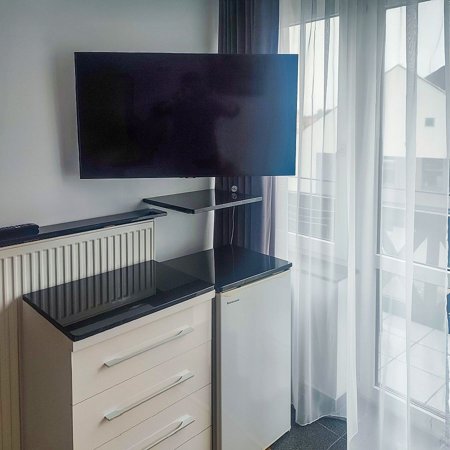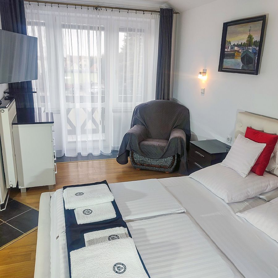 Pokój 3-osobowy z balkonem od strony zachodniej. w pokoju łoże małżeńskie tapicerowane (160 cm szer.), tapczan, TV 30 cali, lodówka 80 cm wys., fotel, stół krzesła, szafa, stoliki nocne. Podłoga — panele podłogowe. Kolorystyka pokoju biało-czarna.