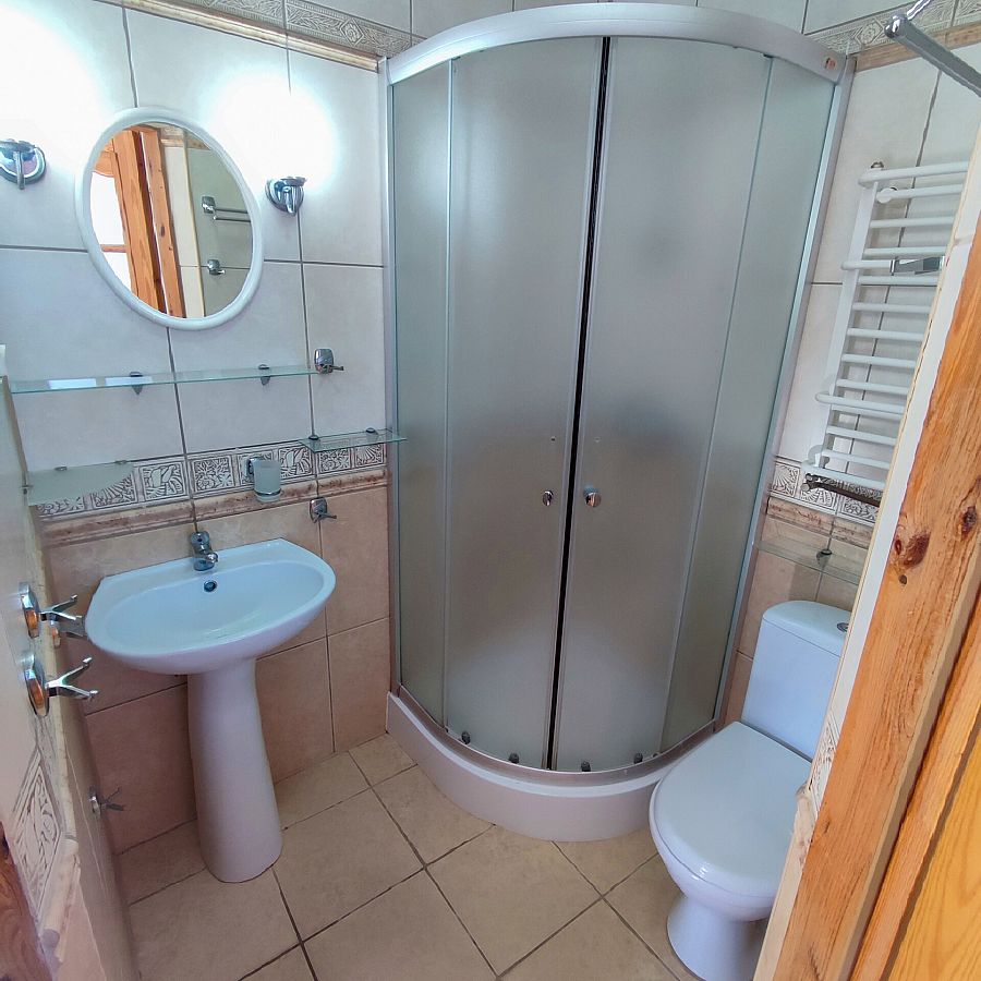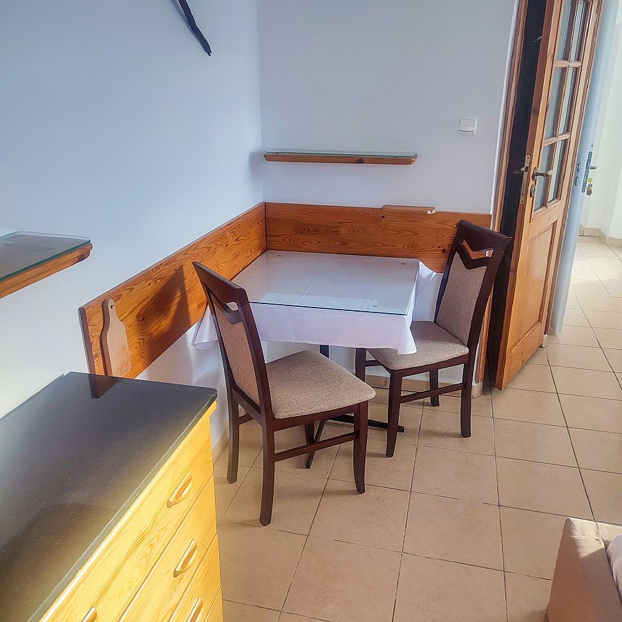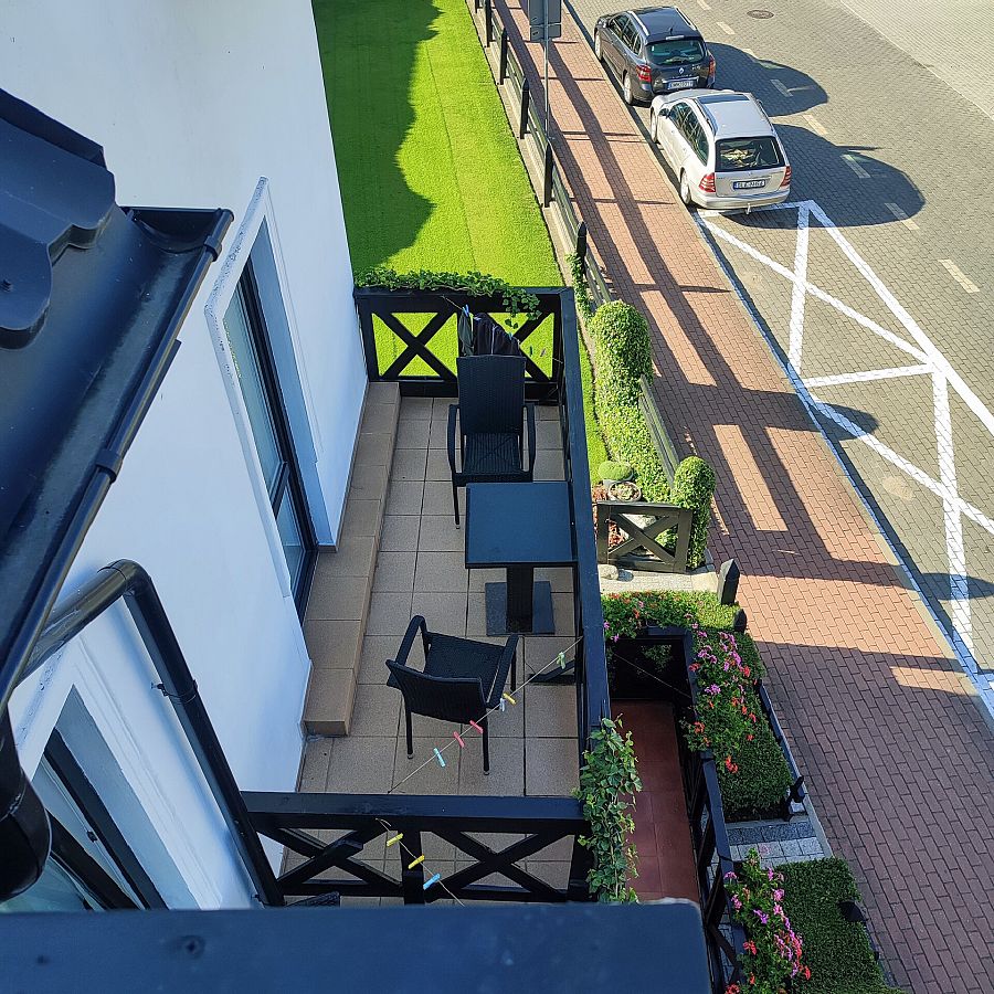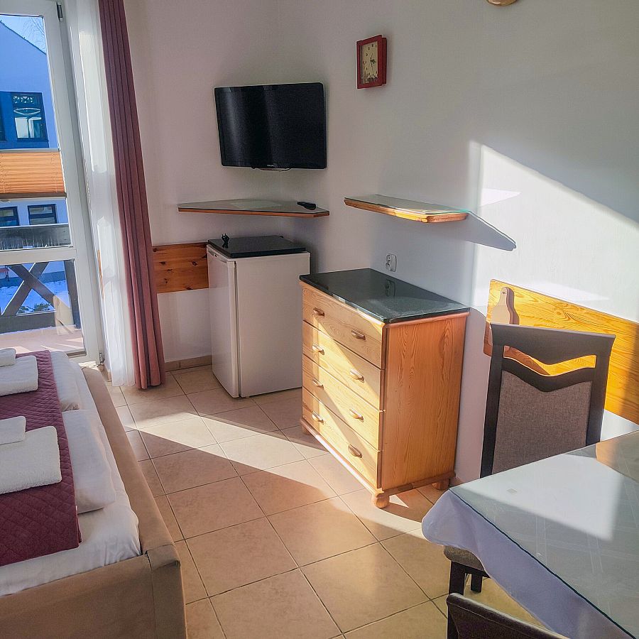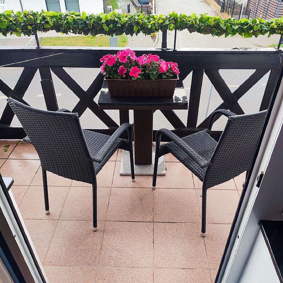 Pokój 3-osobowy z balkonem od strony zachodniej, I piętro. W pokoju łoże małżeńskie "Vanessa" (160 cm szer.), duża pojemna szafa, lodówka, TV 32 cale, stół, krzesła, komoda szafka nocna, wersalka, okna od strony zachodniej i południowej. Balkon od strony zachodniej. Na balkonie stolik, krzesła balkonowe. Kolorystyka — białe ściany, beż.